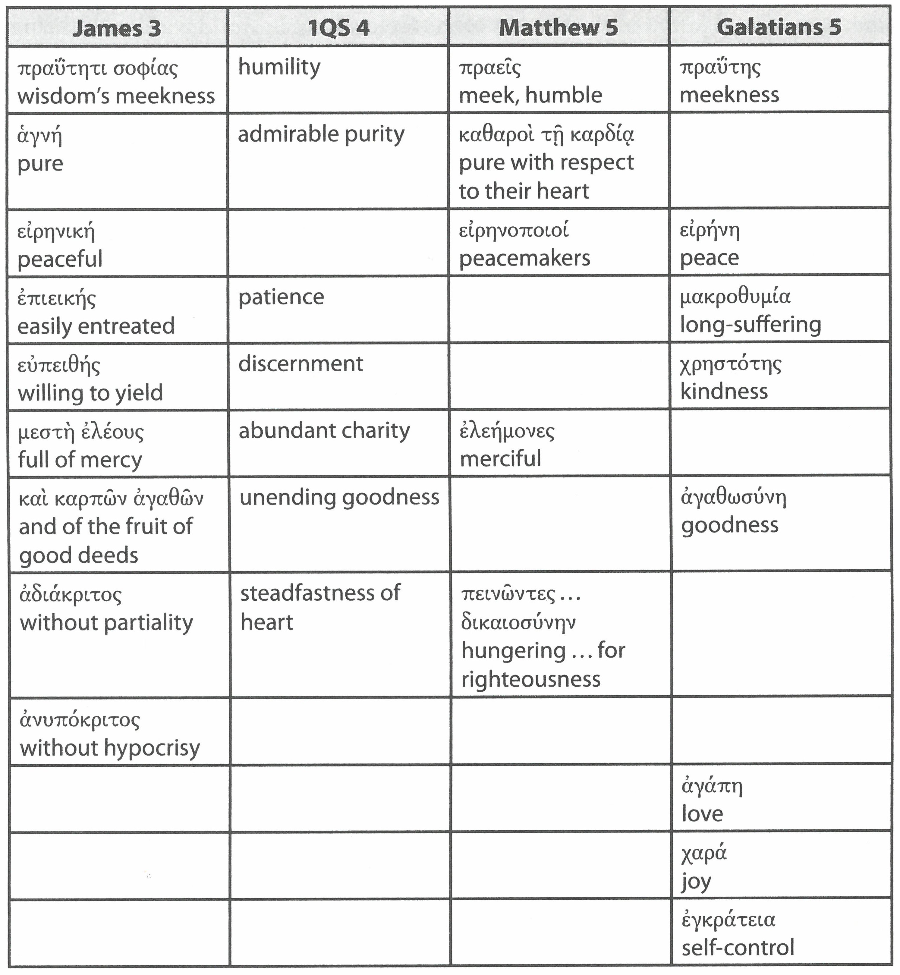 As you read about wisdom in the book, particularly in 3:13-18, you see that God’s gift of wisdom enables one to live a life of integrity and consistency. So, the fruit of wisdom in James actually parallels the Fruit of the Spirit in Galatians 5. The fruit of wisdom, according to James, includes humility, purity, peace, gentleness, an openness to reason, mercy, and general good fruits, impartiality, and sincerity. Peter Davids has a wonderful chart showing the overlap between these fruits, the fruit of the Spirit as explained by Paul, and the characteristics of Kingdom people in the Sermon on the Mount (A Theology of James, Peter, and Jude, 76).